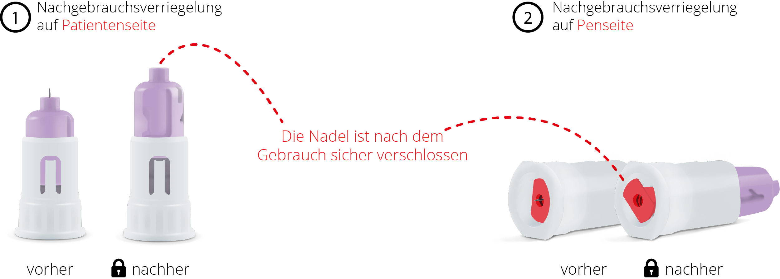 Die Sicherheits-Pen-Nadel mit der zweifachen Nachgebrauchsverriegelung zur Verringerung der Verletzungsgefahr.