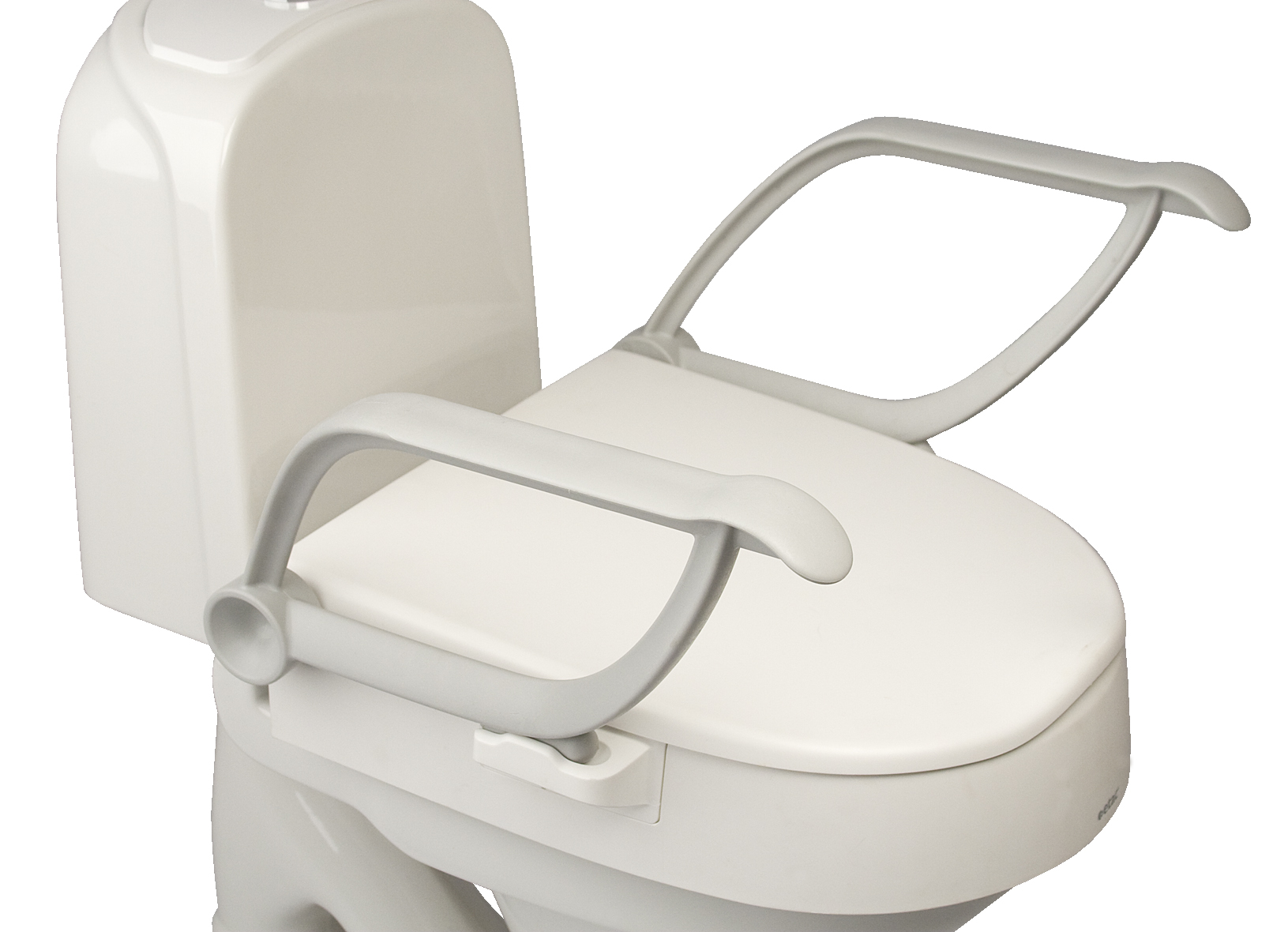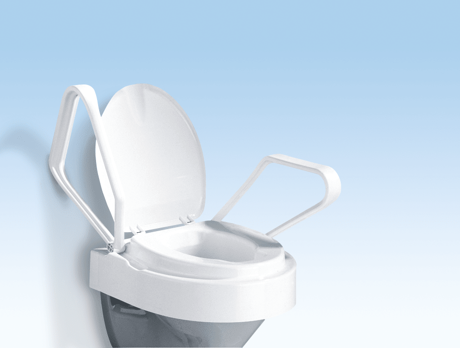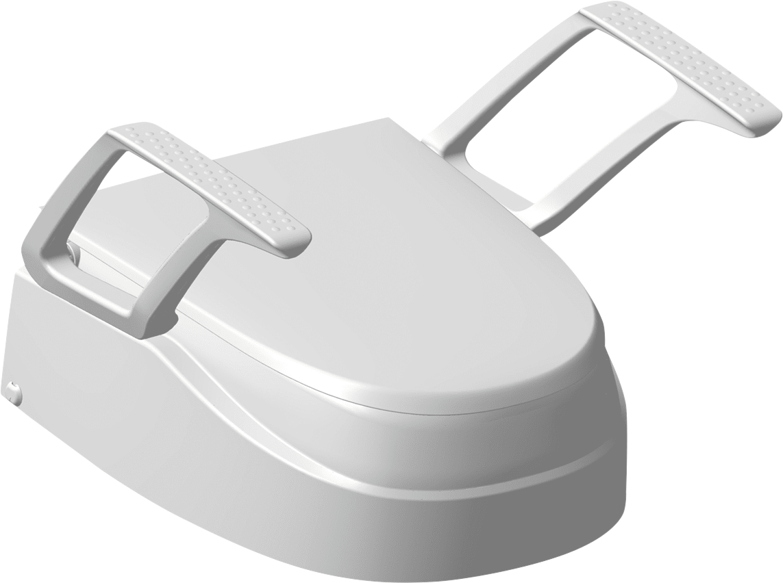 Dreifach höhenverstellbare Toilettensitzerhöhung, die schnell und ohne Werkzeug zu montieren ist. Stabile Armlehnen bieten eine gute Unterstützung beim Hinsetzen und Aufstehen.