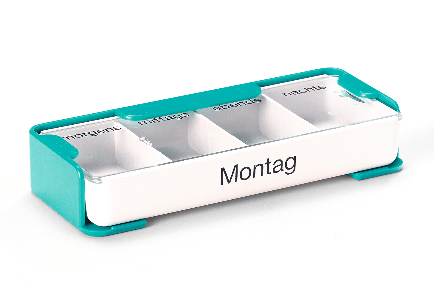 Abschließbarer Wochendispenser, mit 7 Tagesdispensern (Mo-So) und einem unbeschrifteten